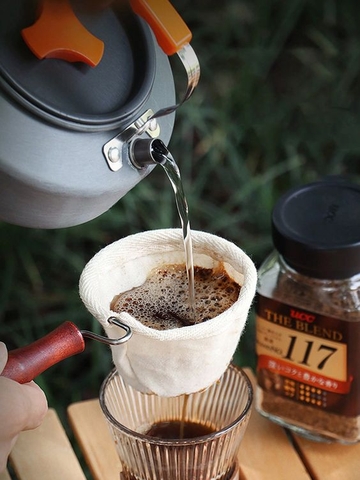 - Bước 2: Đặt bột cà phê vào giữa tấm vải lọc, sau đó đổ nước sôi vào và bắt đầu quá trình pha.